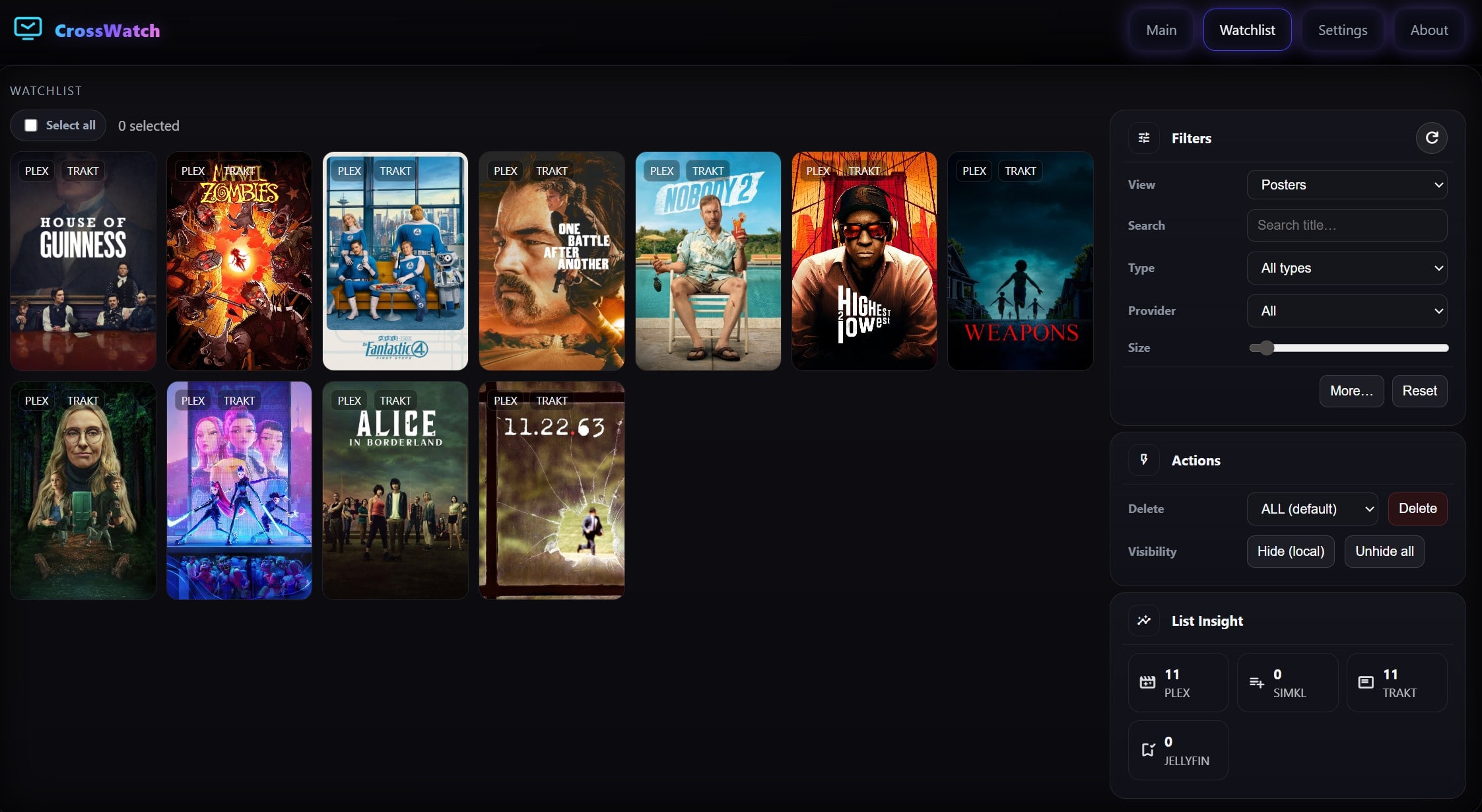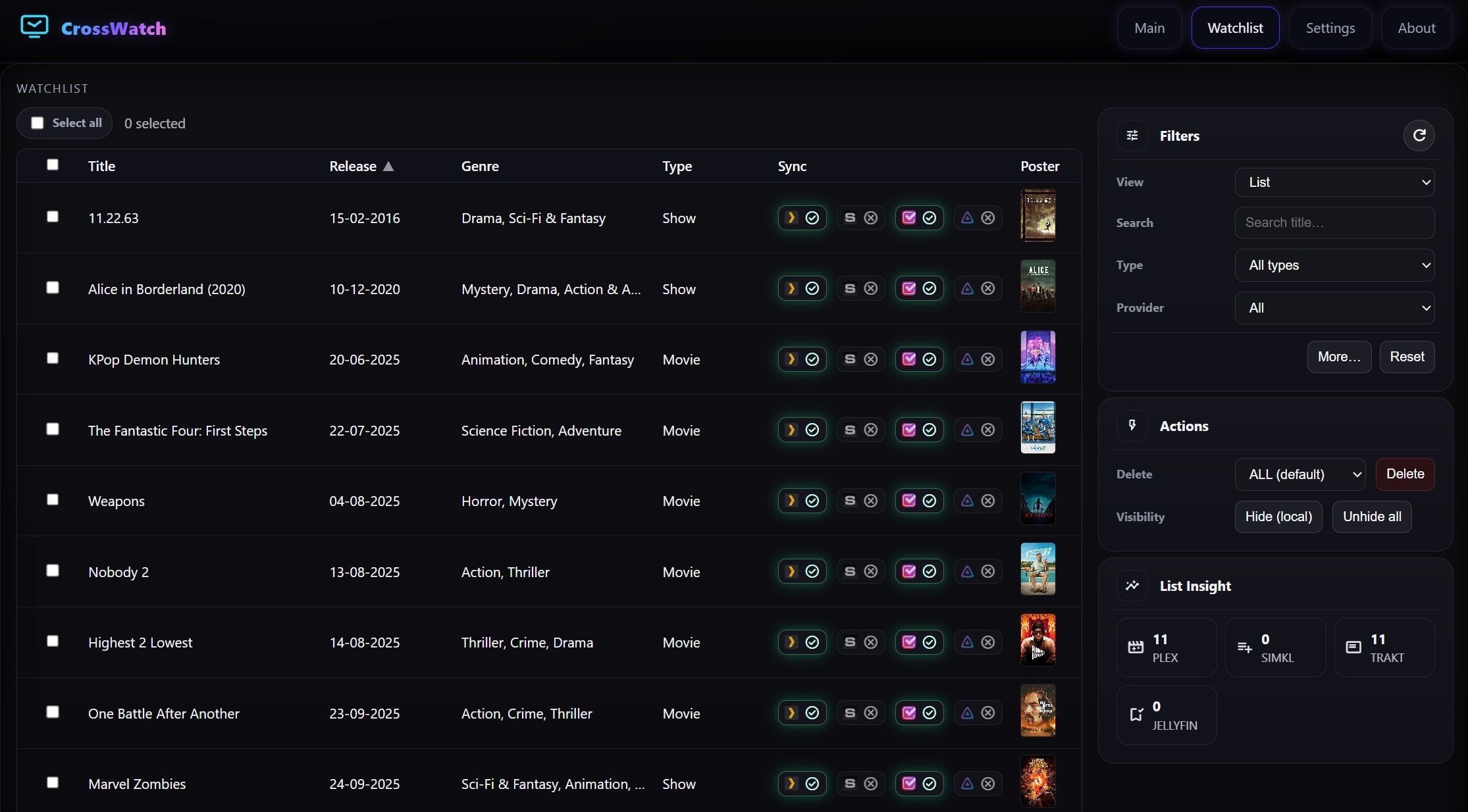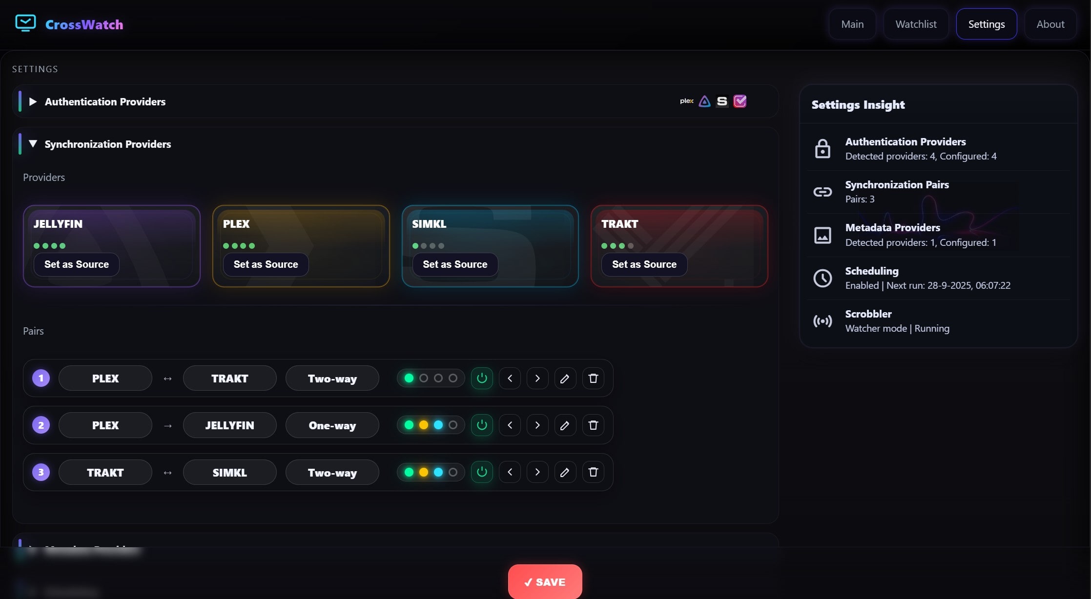 CrossWatch/CW is a synchronization engine that keeps your Plex, Jellyfin, Emby, SIMKL, Trakt, AniList, MDBList and Tautulli in sync. It runs locally with a web UI where you link accounts, define sync pairs, run them manually or on a schedule, and review stats and history. CW also includes its own tracker to keep your data safe with snapshots.
